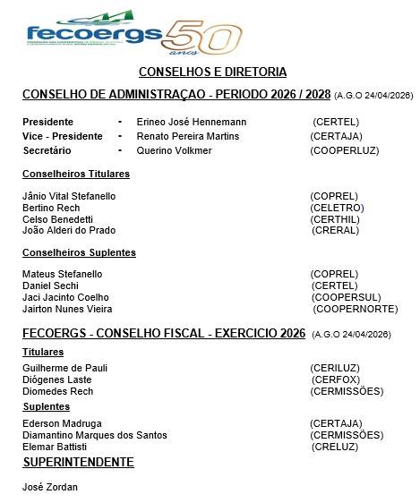 Além da apresentação do desempenho das cooperativas, foi realizado o processo de eleições da Fecoergs, para o Conselho de Administração e Diretoria, período 2026/2028 e para o Conselho Fiscal, para o ano 2026, sendo os eleitos conforme segue: